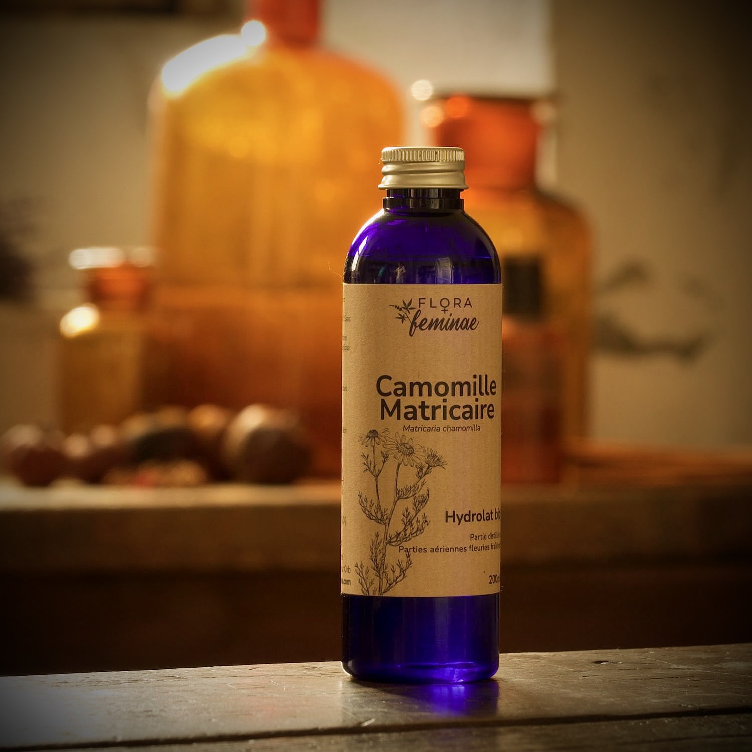 Parties aériennes et sommités fleuries fraîches de Camomille matricaire issues de l’Agriculture biologique, alcool issu de l’Agriculture biologique, eau de source - En hydrolat :