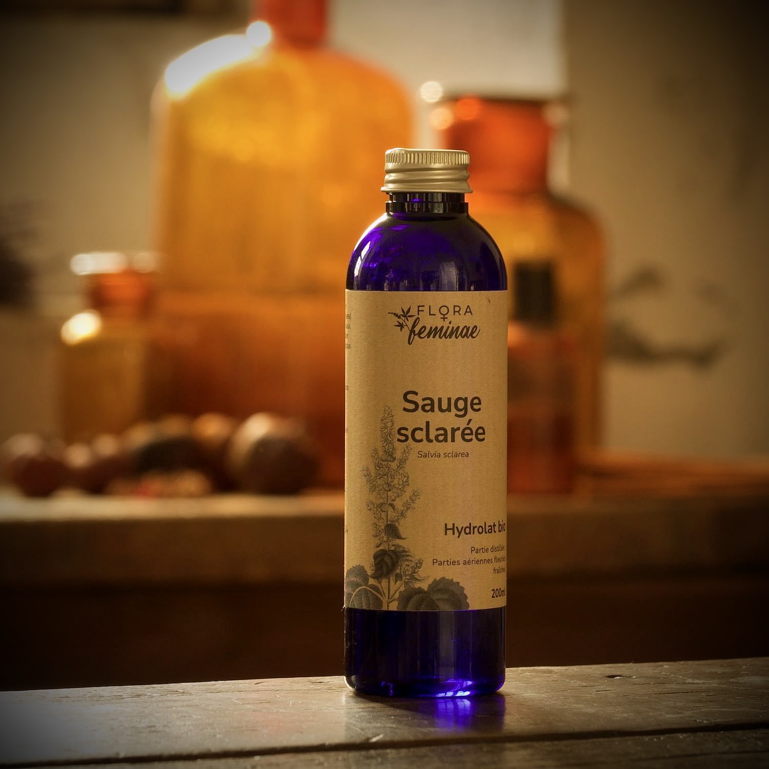 Feuilles et sommités fleuries de Sauge sclarée issues de l’Agriculture biologique, alcool issu de l’Agriculture biologique, eau de source