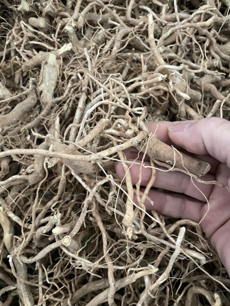 La récolte est exigeante. Les racines sont longues, profondément ancrées, et le froid ou la pluie compliquent le travail. Après plusieurs essais mécaniques, j’ai choisi une récolte manuelle, à la bêche ou à la grelinette, pour préserver les racines. Plusieurs milliers de plants sont ainsi déterrés à la main. Le lavage se fait également racine par racine. C’est un travail lent, physique, mais essentiel pour garantir la qualité.